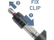 Klíč momentový na hroty 1/4". Celokovové provedení s anodizovanou hliníkovou rukojetí. Mechanismus funkce Fix-Clip pracuje tak, že hrot je po lehkém zatlačení do držáku pevně zafixován a pro jeho vyjmutí je třeba vnější prstenec nejprve zatlačit směrem k rukojeti a poté hrot vyjmout. Stupnice nastavení kroutícího momentu (Δ) po 0,05 Nm.