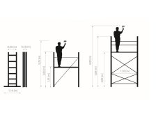 Lešení - multifunkční s širokým spektrem použití. Jednotlivé prvky lešení lze využít jako samostatně stojící dvouprvkový žebřík, naklápěcí žebřík a pracovní plošinu.