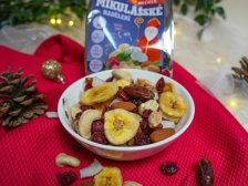 Mikulášské nadělení do kapsy pro všechny hodné děti jsme namixovali ořechy, kokos, brusinky, mini fíky, medový banán a další zdravé zobání. Tahle nadílka se vejde do kapsy a je bez lepku, umělých barviv a palmového oleje.