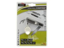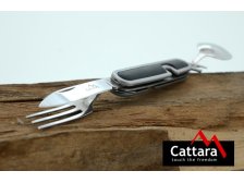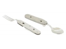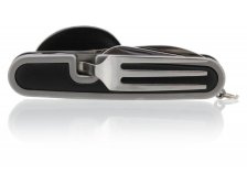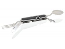 Skládací nožík, s nástroji z nožířské oceli. Ryzí pomocník pro camping a jiné outdoor využití. Nůž je v provedení z celokovu a rukojeť je doplněná o měkké plastové vložky, zpříjemňující držení. Nůž se rozděluje na dvě části a to povytažením jedné části vpřed. První část nože se skládá z vidličky, otvíráku na plechovky a víčka lahví, druhá část skrývá lžíci a samotnou čepel nože. Čepel je zhotovena z nožířské oceli 420J1, dosahuje tvrdosti HRC45-48, ostatní jmenované nástroje jsou zhotoveny z nožířské oceli 420J2. Oba materiály jsou obzvláště vhodné do nepříznivého prostředí, kde excelují svou korozivzdorností. Nůž je dále vybaven kroužkem, pro připevnění např. na klíčenku. Díky svým malým rozměrům se však vejde i do jakékoliv kapsy.