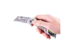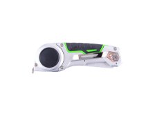 Kovový, zabezpečený proti otevření bezpečnostní pojistkou. Lichoběžníkový břit, plátek SK4 (snadná výměna). Součástí nože 2ks náhradních břitů. Metr svinovací o délce 2,5 m, stop: černé stop kolečko. Šířka pásky metru 13 mm. Kovová spona na opasek.