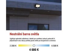 Řada LED reflektorů GLARO nabízí spolehlivý světelný výkon, vysokou účinnost a dlouhou životnost. Díky krytí IP65 jsou reflektory plně připraveny na venkovní použití a bez problému odolají dešti, prachu i nízkým teplotám. Odolné hliníkové tělo zajišťuje skvělou mechanickou odolnost a efektivní odvod tepla. Představují ideální volbu pro osvětlení domů, zahrad, garáží i firemních objektů. Spojují vysoký výkon s dostupnou cenou, takže je ocení každý uživatel. Vynikají vysokou světelnou účinností 100 lm/W, což znamená, že při zachování silného světelného výkonu spotřebují méně energie než běžné LED reflektory. Díky tomu získáte jasné a efektivní osvětlení při nízkých provozních nákladech, ať už osvěcujete dům, garáž, zahradu nebo komerční objekt. Navrženy s praktickou zešikmenou montážní konzolí, která umožňuje rychlou a pohodlnou instalaci na stěnu, fasádu či jiný podklad. Díky možnosti nastavení úhlu osvětlení přesně podle potřeby můžete světlo směrovat tam, kde je nejvíce potřeba, aniž by bylo nutné složité vrtání či úpravy. Jednoduchá montáž šetří čas i námahu a dělá z GLARO ideální volbu pro domácí instalace. Svítí neutrální bílou barvou světla, která nabízí přirozené a komfortní osvětlení bez ostrých modrých tónů ani žlutého nádechu. Zajišťuje optimální viditelnost a věrné podání barev. Díky tomu se prostor osvětluje rovnoměrně, světlo je příjemné pro oči a vytváří bezpečné prostředí pro pohyb i práci.